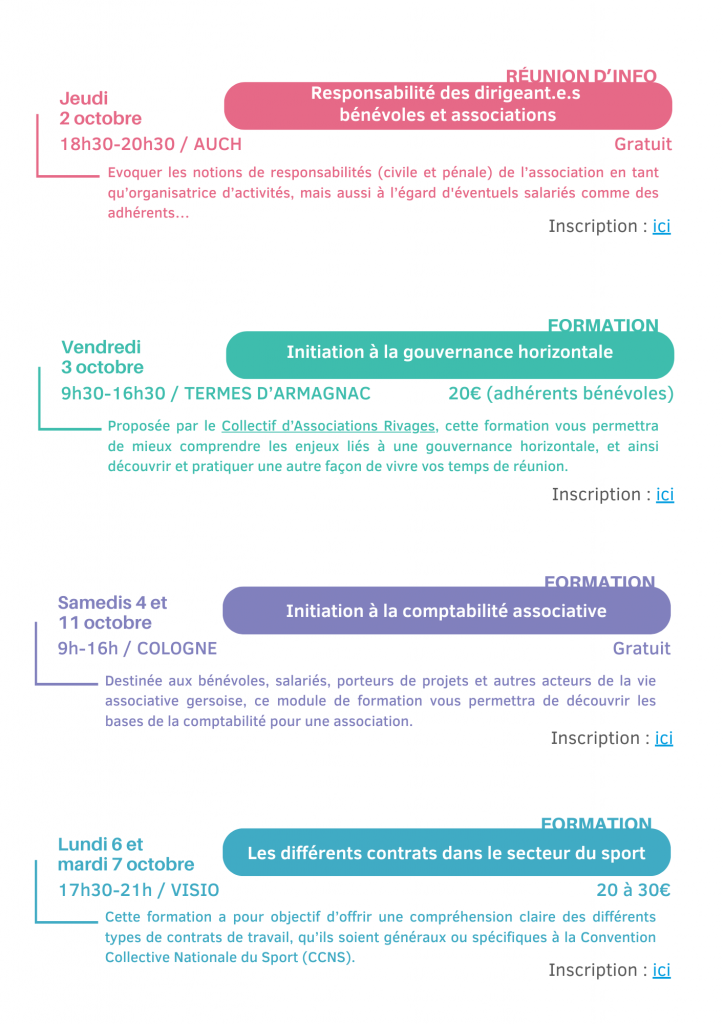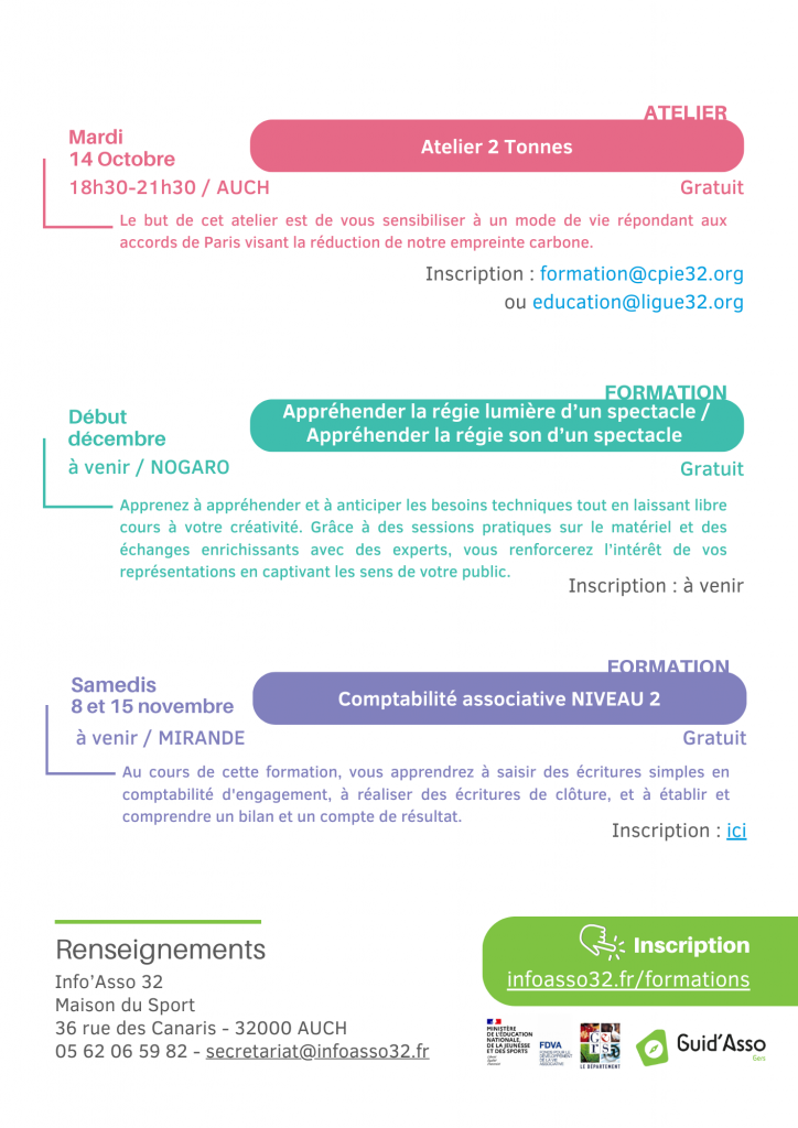 Vous avez comme projet de créer une association ou souhaitez renforcer vos connaissances et acquérir de nouveaux savoir-faire ? Ces formations, dispensées par le réseau Guid’Asso 32 et ses partenaires, sont faites pour vous !